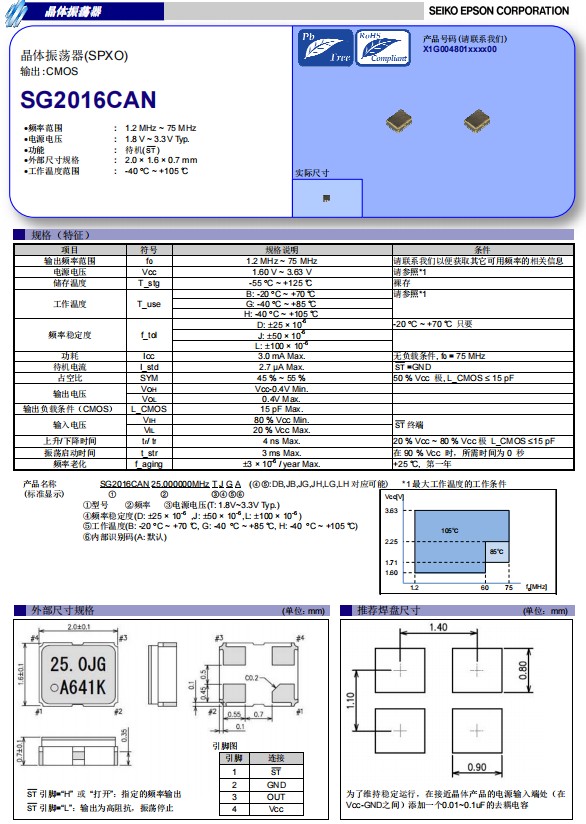 日本愛普生晶振SG2016CAN,是一款小體積晶振尺寸2.0x1.6mm石英晶體振蕩器(SPXO),支持CMOS輸出電平,四腳貼片晶振,有源晶振,1.8V至3.3V的寬工作電壓和寬工作溫度范圍從-40℃到+85℃(+105℃)。 SG2016CAN有源晶振還具有超低功耗的優(yōu)點。響應(yīng)時間僅為3ms,上升/下降延遲時間為4ns。在工作頻率為20MHz,無負載情況時,工作電流可達1.8mA,待機狀態(tài)下的電流可達2.7μA。所以,在5G前傳光模塊方案中,如果需要MCU主頻更穩(wěn)定,外置高溫、穩(wěn)定性好的5G晶振時,EPSON公司推出的SG2016CAN晶振是較理想的選擇。常用有源晶振型號SG2016CAN編碼X1G004801005800,頻率20.000MHz,工作溫度-40℃至85℃.具有超小型,輕薄型,低抖動,低功耗,低損耗,低耗能,低電流消耗等特點,非常適合5G模塊,物聯(lián)網(wǎng)、可穿戴設(shè)備、醫(yī)療設(shè)備、工業(yè)自動化等各種應(yīng)用。