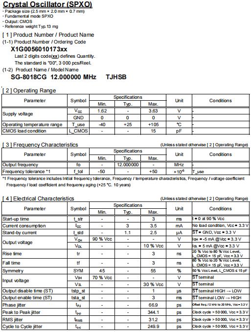 | X1G005601017300 | SG-8018CG | 12.000000 MHz | 2.50 x 2.00 x 0.80 mm | CMOS | 1.620 to 3.630 V | -40 to 105 °C | +/-50 ppm |