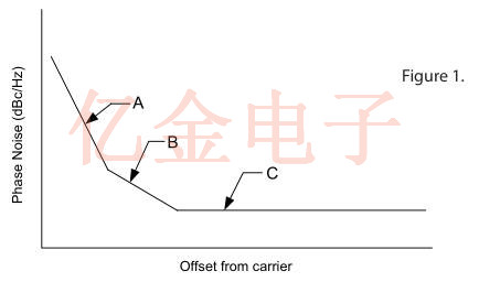 在所需信號(hào)的各種偏移處的響應(yīng)圖通常由對(duì)應(yīng)于振蕩器中的三個(gè)主要噪聲產(chǎn)生機(jī)制的三個(gè)不同斜率組成,如圖1所示.相對(duì)靠近載波(區(qū)域A)的噪聲稱(chēng)為閃爍FM噪聲;其大小主要取決于晶振晶體的質(zhì)量.最佳近距離噪聲結(jié)果是在4-6MHz范圍內(nèi)使用5次泛音AT切割晶體或第3次泛音SC切割晶體獲得的.雖然平均效果不是很好,但使用10MHz區(qū)域中的3個(gè)泛音晶體也可以獲得出色的近距離噪聲性能,尤其是雙旋轉(zhuǎn)型,較高頻率的晶體由于其較低的Q值和較寬的帶寬而導(dǎo)致較高的近距噪聲.