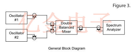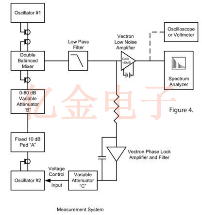 圖3示出了由NIST建議并由Vectron晶振用于測(cè)量l(f)的方法的框圖.來(lái)自?xún)蓚€(gè)相同標(biāo)稱(chēng)頻率的振蕩器的信號(hào)被施加到混頻器輸入.除非振蕩器具有出色的穩(wěn)定性,否則一個(gè)振蕩器必須具有用于鎖相的電子調(diào)諧.非常窄的頻帶鎖相環(huán)(PLL)用于在這兩個(gè)源之間保持90度的相位差.混頻器操作使得當(dāng)輸入信號(hào)異相90度(正交)時(shí),混頻器的輸出是與兩個(gè)振蕩器之間的相位差成比例的小波動(dòng)電壓.通過(guò)在頻譜分析儀上檢查該誤差信號(hào)的頻譜,可以測(cè)量這對(duì)振蕩器的相位噪聲性能.如果一個(gè)振蕩器的噪聲占主導(dǎo)地位,則直接測(cè)量其相位噪聲.當(dāng)兩個(gè)測(cè)試振蕩器電氣相似時(shí),有用且實(shí)用的近似是每個(gè)振蕩器貢獻(xiàn)測(cè)量噪聲功率的一半.當(dāng)三個(gè)或更多個(gè)振蕩器可用于測(cè)試時(shí),可以通過(guò)求解表示從振蕩器對(duì)的置換測(cè)量的數(shù)據(jù)的聯(lián)立方程來(lái)精確地計(jì)算每個(gè)振蕩器的相位噪聲.