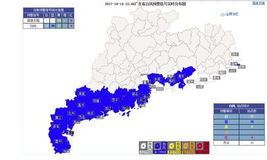 截至15:46時(shí),廣東全省共有26個(gè)市縣發(fā)布臺(tái)風(fēng)藍(lán)色預(yù)警信號(hào).