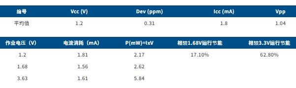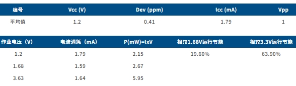以下測(cè)試結(jié)果展示了1.2V TCXO的卓越功耗效率。 與1.68V和3.3V運(yùn)行相比,1.2V在兩種封裝上都實(shí)現(xiàn)了顯著的節(jié)能效果。