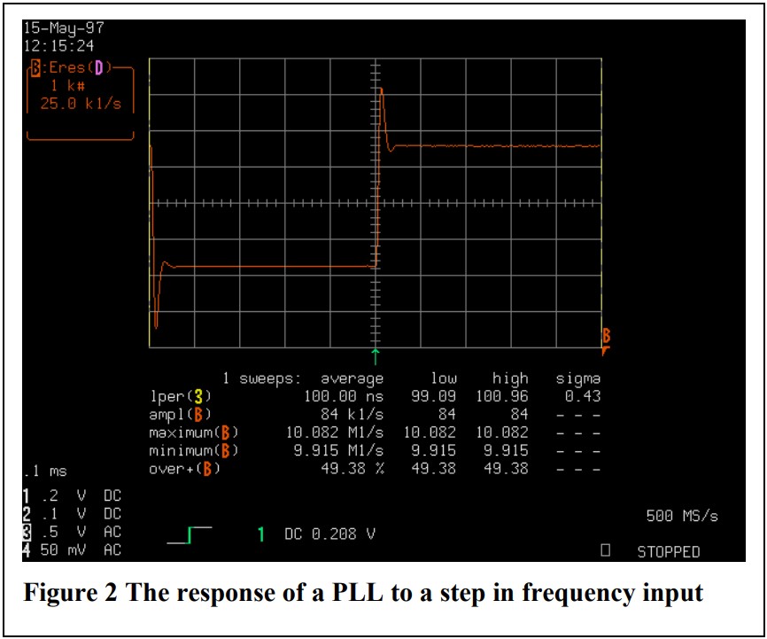 典型的例子 PLL動(dòng)態(tài)測(cè)量 響應(yīng)如圖2所示。 該P(yáng)LL用于頻率合成器和顯示了對(duì)80的響應(yīng)10MHz中的kHz步進(jìn) 參考輸入。這個(gè)電路 捕捉范圍約為中心頻率的+/- 5%