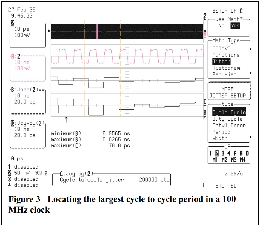 工程師可以 驗(yàn)證系統(tǒng)時(shí)鐘通過以下方式滿足本規(guī)范 測(cè)量系統(tǒng)時(shí)鐘 使用抖動(dòng)跟蹤循環(huán)來(lái)循環(huán)。 這如圖3所示。 在100 us記錄中最大循環(huán)周期 差70 ps。這個(gè)值 是直接從抖動(dòng)跟蹤周期到周期 軌跡c中的波形。該區(qū)域 在垂直參數(shù)之間 光標(biāo)標(biāo)記最大值。 跡線A是 采集的數(shù)據(jù)并顯示 兩個(gè)相鄰的循環(huán)最大差異。 軌跡B是抖動(dòng)軌跡讀取絕對(duì)值的周期 的每個(gè)周期的周期 時(shí)鐘波形。貼片石英晶振