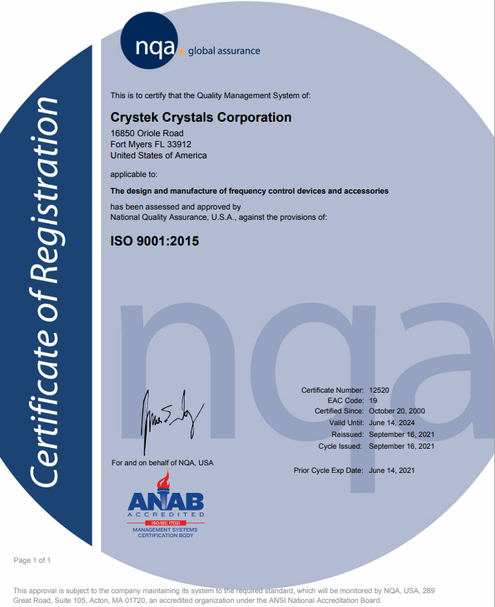 Crystek Corporation is an ISO9001:2015 certified organization with its corporate headquarters located in Fort Myers, Florida.
