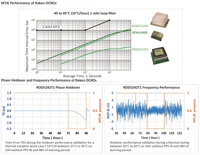 Rakon 已經(jīng)表征了在不斷變化的環(huán)境條件下,在各種環(huán)路帶寬下與分組網(wǎng)絡(luò)、MTIE 和 TDEV 性能相關(guān)的環(huán)路時(shí)間段的各種類型的振蕩器。