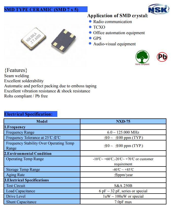 更多>>津綻晶振,NXD-75型號(hào)晶振,7050四腳晶振